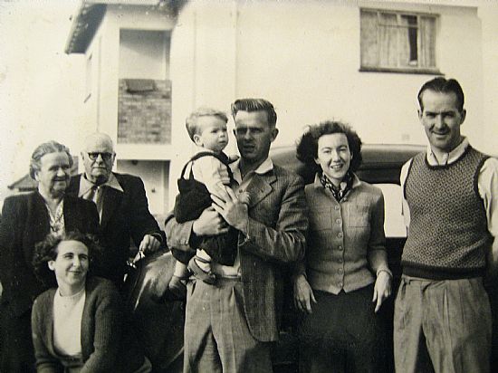 Nana and Da, ie Annie and Cuthbert Wells, my maternal grandparents stand behind Pamela Watson, my mother, their daughter. Hugh Wells, their son and my uncle, holds me. Next to him is Margaret Wells, Hugh's wife, my aunt. And next to them is my father Brian Watson. This picture was taken at 10 Tait Road, Baysville, East London, South Africa. We later moved into number 12, the double story seen in the background, and my grandparents moved into number 10. I was born in 1951, but am unsure of my exact age in the picture. Not yet two as my brother had not yet been born.