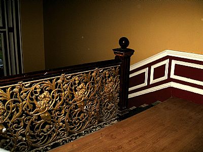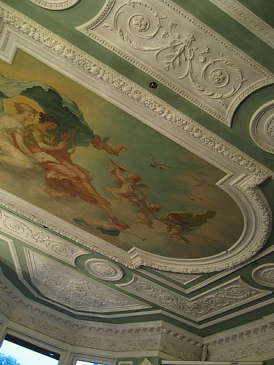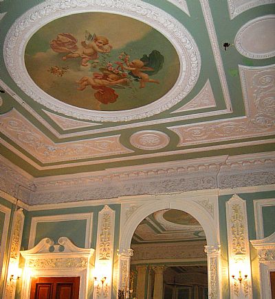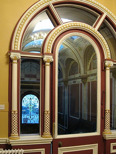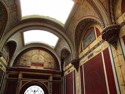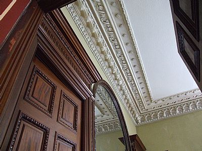 The building is entered from a porte-cochere into an entrance porch of very unusual form. The photograph nelow shows part of the porch with its “Etruscan” design. Above the frescos is a vaulted glazed ceiling with etched glazed panels with roofights above them. (They appear black in the photograph because of the lighting conditions). While various parts of the building have been restored, this area with its unique design and damp has so far proved out reach of suitable skilled attention.