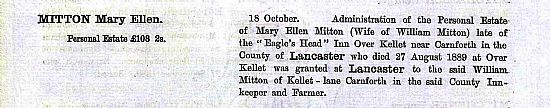 Mary Ellen died on 27th August 1889 at the Eagle Head, Over Kellet
