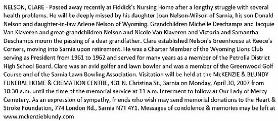 Clarence died in 2007 at Petrolia, Ontario, Canada