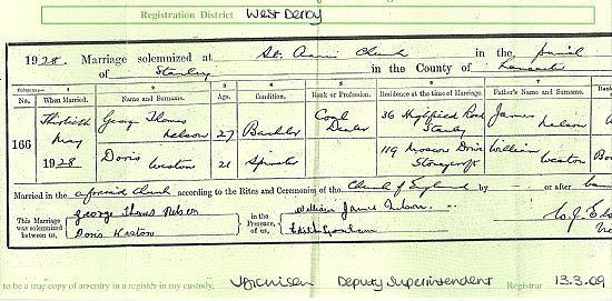 George married Doris Weston on 30th May 1928 at St Anne’s Church in Stanley. At the time of the marriage, he was living at 36 Highfield Rd, Stanley, and is described as a coal dealer. William James Nelson was the best man.