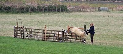 D Purtill, host, and Mist face off a stubborn ewe on their way to a successful shute.
