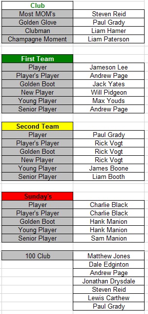 Andrew Page and Rick Vogt were the big winners at Awards Night 2016.  The Ginger Prince took home Players’ Player of the Year, as well as Senior Player of the Year for the First Team.  Rick Vogt took home the 2nd Team Players’ Player of the Year, New Player of the Year, and the Golden Boot award.  Jameson Lee and Paul Grady won the Player of the Year awards for the First and 2nd teams respectively, whereas Charlie Black won the same award for the Sunday team.  Paul Grady also secured the club Golden Glove award thanks to a final day clean sheet.  Full List of winners below…