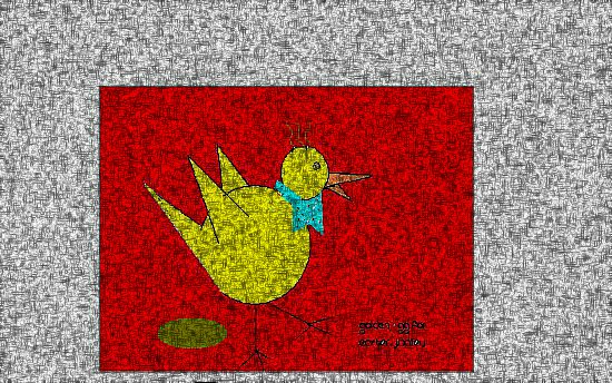 This simple painting of a chicken and egg is transformed by some graphics wether it improves the original picture or just adds interest is another matter.