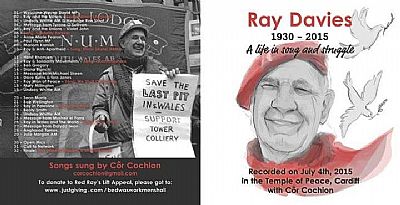 A dvd of that memorable event will be available shortly. It includes a live recording of some of the songs from the many campaigns he was involved in- "Miners Lifeguard", "Solidarity Forever ""Nkosi Sikelele", "The Wall", "Guantanamera" ,"Yma o Hyd" - in the incredible acoustics of the Temple of Peace; and tributes from Wayne David MP, Paul Flynn MP, Lindsay Whittle AM, Angharad Tomos and many others whose lives Ray touched.