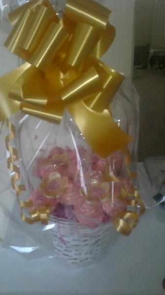 This is of the whole rose basket that has been carefully wrapped with ribbon and cellophane. |