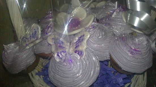 This is a 10 piece lavender mini cupcake basket that was created for a mothers day surprise. it boasts a subtle lemon flavor in the hand made butter cream frosting and is speckled with edible butterflies and daises with hints of sparkle in every one. |