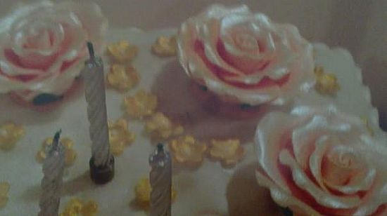 This is a close up of my mothers birthday cake with edible hand made roses with a hint of gold sparkle. |