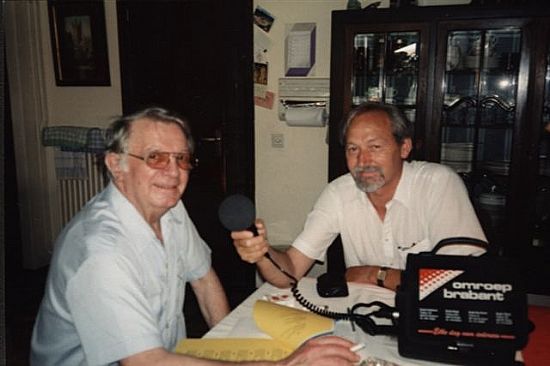Thieu Sijbers wordt geintervieuwd door een nog jonge Cor Swanenberg, toen nog werkzaam voor omroep Brabant, in het huis van Thieu Sijbers in Steensel. Foto gemaakt door Nelleke de Laat.