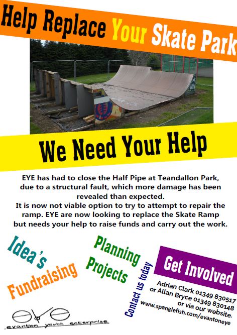 EYE are looking for People in the village to get involved with the Skate Ramp Project. The existing ramp is going to have to be removed as it is not a viable option to attempt to repair.