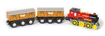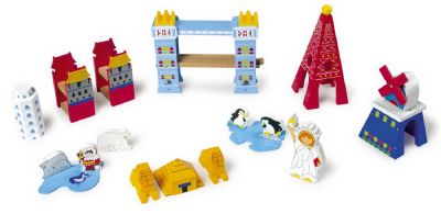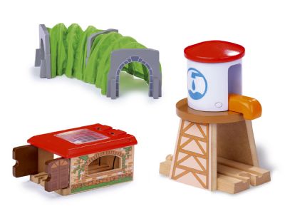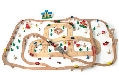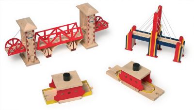 Railway accessories3 part set including a tunnel made of wood and fabric, engine shed with a transparent roof with lifts the rails so the trains can roll out by magic and a water tank. | Set of bridges and ferriesThree bridges for the train tracks and two ferries for the road track | | 180 piece train and road setA large train set with a road set which can be used underneath the train set comes with loads of accessories | 101 piece train set101 piece train set with loads of accessories Size approx 150cm | | Battery powered train with two carriagesBattery powered train moves forwards, backwards and also makes train noises Requires one AAA battery Size approx 11cm x 5cm | Village10 piece set which makes a village to sit beside your train set Comes in a Cotton bag for easy storage | | Around the world in 80 days train accessories18 piece set with buildings and landmarks from around the world | | |