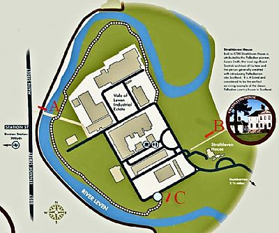 A highlight of the walk, if you choose to include this part, is the historic STRATHLEVEN HOUSE, Vale of Leven Industrial Estate. The walk takes in some of the grounds with the house, a doocot and stables block links for which are found under that subject. Also look out for the location of the formal gardens with its walled garden within it. Unfortunately there is nothing really to see of them. That area has long laid abandoned and has recently been cleared for development.