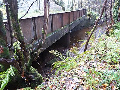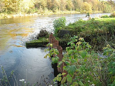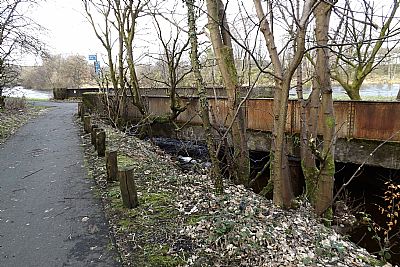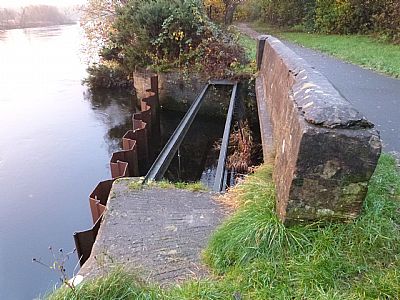 Where the lade flows back into the Leven it passes below a the towpath on a small stone bridge. You can see that some sort of sluice control existed by the grooves in the walls and a metal walkway, of which only the supports remain, was used to access it. As seen at the inflow, heavy steel sheet piling has been set to limit or even stop the flow.