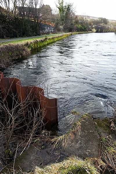 The inflow to which the weir directed flow from the Leven. The sheet piling was presumably intended to be a temporary barrier, but is still there.