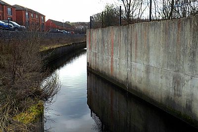 From where it turns back towards the Leven, the lade is now rather formidable. An opportunity missed? When the new housing was built, the land was raised to avoid any residual contaminants and to avoid extreme high water if the Leven floods.