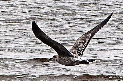 It is much smaller than the others mentioned above, but can be readily identified. Its bill is much finer and lack the red spot of herring gulls. The legs are pale green-yellow. Common gulls sometimes nest on buildings. Large numbers of common gulls migrate into Scotland from Scandinavia in winter.