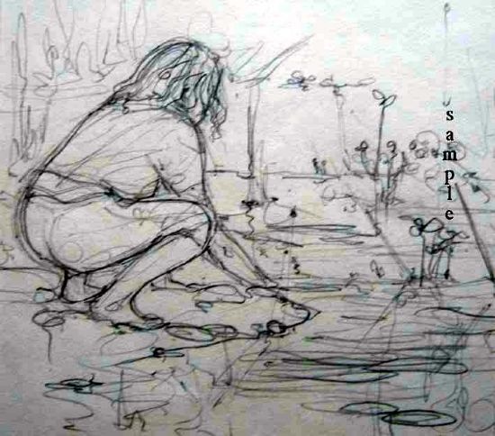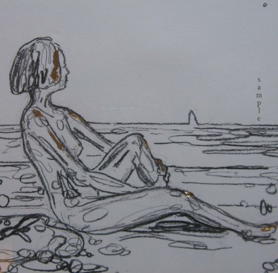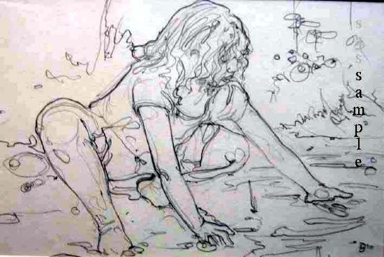 On the beach Charcoal on paper 20cm x 20cmYou can purchase a limited edition print of this drawing in charcoal with gold leaf signed by the artist for £80.00. Alternatively you can commission a signed replica drawn in charcoal on quality cartridge paper for £180.00. Please contact me for further details. | Girl in the pond pencil on quality cartridge paperYou can order a limited print of this drawing signed by the artist for £65.00. Please contact me for further details. |