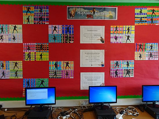 The pupils decorated their classrooms with interactive wall displays, colourful posters and individually designed tartans, which incorporate silhouettes of different competitors at a Highland Games. Lists of all the equipment that is required to hold the various events and lists of interesting facts about Highland Games, were also made. They also created their own Highland Games events.