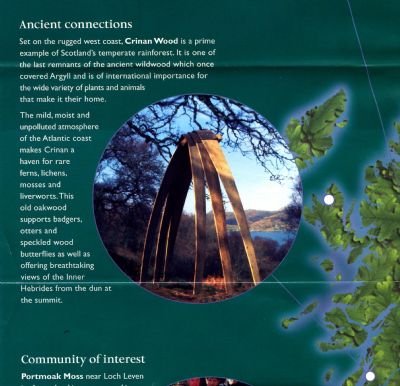 text and design input to suite of leaflets produced by Woodland Trust Scotland Interpretation....visitor centre design and production of a wide range of structures, furniture, models and hangings, interpretive boards and information panels for Clyde Muirshiel Regional Park visitor centre