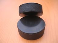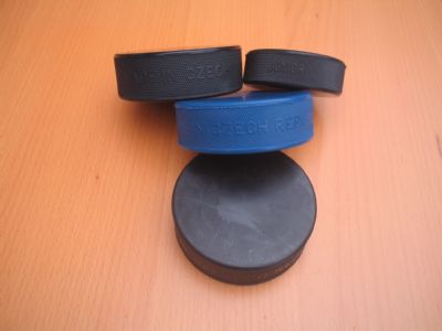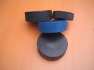 We also supply regular full size 6 oz. black smudge free pucks or full size 4 oz. BLUE coloured pucks, or smaller 3 oz. black pucks to special order
