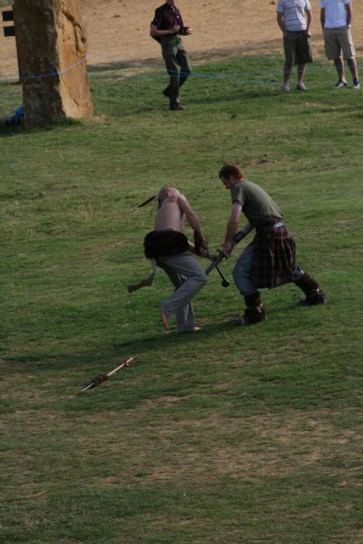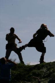 Conversely, actors who insist on choreographing every element to their fight also fall short of their intended standard, as the sudden impact of the audiences attention "under the limelight" brings a rushed, badly concealed "we're rushing through our lines" approach. Impro-Choreographed Stunt Combat works along the obvious lines of combining the two; certain parts of the display are well rehearsed moves, which punctuate periods of tense uncertainty. As already mentioned, we are finding this approach works very effectively, both in terms of enjoyment for the participants, and general good entertainment value for the spectators.