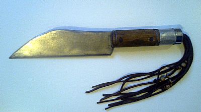 "Battle-ready" steel Seax-style utility knife, with leather tassle hilt