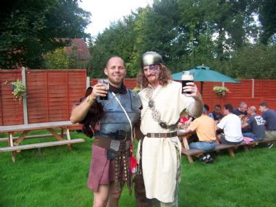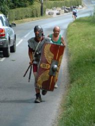 Pausing at the "Silent Woman" the two Joe's take some refreshment. The walk raised money for St Mary's First School in Swanage, where Legion XXXIII has previously entertained children with basic history displays on the kit and tactics of a Roman legionary (pictured below, member Darrell aka Brutus brings the Roman soldier to life for Year 5 & 6 pupils - 2005)