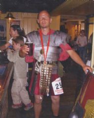 Here is the "before" pic, taken with a good friend and co-runner just before the start of the race. It actually displays the full (summer) costume very well, though the hiking boots I was running in are a far cry from hobnailed sandals! Obviously our winter kit includes items like fur undergarments, woolen tunics and sometimes cloaks too, as can be seen on the Stunts/choreography page.