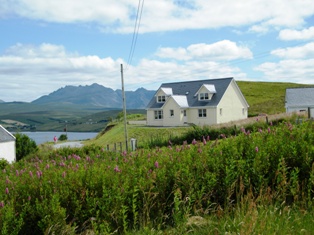Lon Ban is on the road to Portnalong just past the Talisker Distillery in the village of Carbost. In this house we have views to the mountain range of the Cuillin Hills and also the sea-views of Loch Harport.