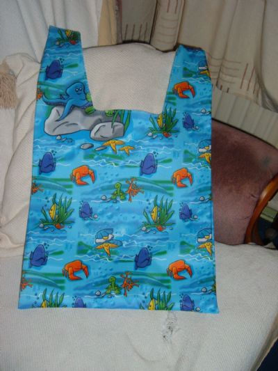 This is the fold-up shopping bag again, this time with a happy "fruit and veg print, it has a blue and white striped lining and snap fastens when folded.