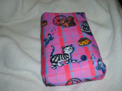 Bright cartoon cats on a black background, purple lining and scotchgaurd protected.