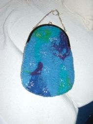 Hand felted turqoise bag with shades of blue, purple and green incorporated, silver embroidered flowers, silver seed beads and a silver clasp fitted with chain handle.