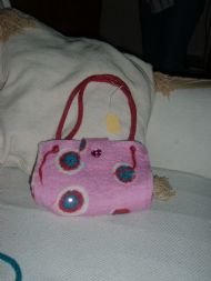 Hand felted pink hand bag with blue, maroon and white pattern, pink sequins hand stitched on, maroon handles and heart shaped button fastener.