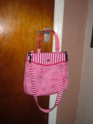 Another reversable bag, this time in pink, hearts and flowers pattern one side, and black patchwork pink hearts on the reverse. It has bamboo handles and detachable shoulder strap.
