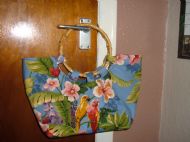 Blue canvas bag, colourful flowers and parrots on a blue background, stripey canvas lining with an inside zipped compartment, bamboo handles. Scotchgaurd protected.