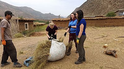 The morning started with coco pops which was a welcome change from bread. Off to the families we went. The morning anned out differently to other mornings as the boys and girls were working together. The boys had a more relaxing day moving rocks and wood which turned into an assortment of other activities. Meanwhile, the girls managed to fill a huge stable with hay using pieces of sacking. Despite half their efforts being stolen by Haymish the cow. The day continued to be productive as the girls scrubbed the mud from a newly built room with the help of Georgina. This was shortly followed by clearing out the donkey stall. Upon joining the boys, everyone gathered for lunch. It turned into a tajine eating competition between the vegetarians and non vegetarians and ended in a tie. The boys invented Moroccan baseball whie the girls joined Warda in the river, washing rugs with their barefeet.