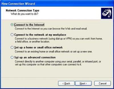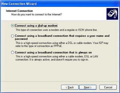 You will want to select the first option, Connect using a dial-up modem. Then click Next to continue.