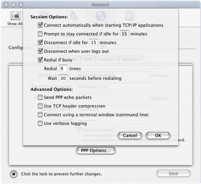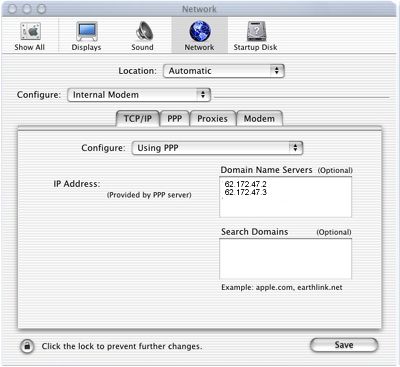 Using the modem selection (in this case, the internal modem in a Powerbook G3), it is fairly easy to set up dial-in networking for MacOS X. Under the TCP/IP selection, use the following settings: