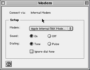 The Modem Control Panel tells Remote Access how to communicate with your modem. As such, set-ups will vary as computers are never the same. The set-up you see above is for an iBook, using its internal modem. You should set your Modem Control Panel as follows: