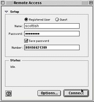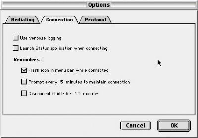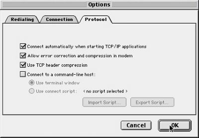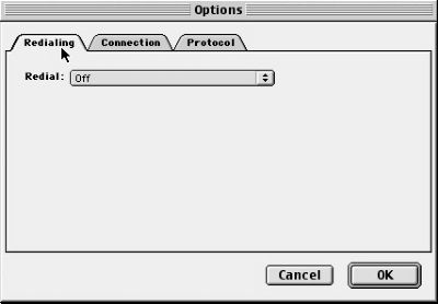 By clicking on the 'Options...' button at the bottom of the Remote Access Control Panel, you'll get the following window, with three options: Redialling, Connection and Protocol.