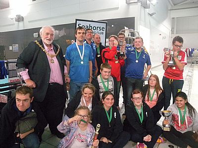 Deputy Mayor of Crewe Town Council, Cllr. Diane Yates,with the successful Seahorse swimmers. HALLIWICK NATIONAL GALA 2015 Erin Yoxall and Hollie Cooke came away as silver medal winners from the Halliwick National Gala at Hull on 17th October 2015. They swam as part of the HASTRA 8 team (North West) that competed against some of the best disabled swimmers in the UK. Erin and Hollie and seven other Seahorse members qualified for the finals after winning their regional heats last month. "The Club is very proud of all the swimmers and it was pleasing to see Erin (Girls 50m) and Hollie (Girls 100m) among the medal winners. The standard is very high in the national championships and the swimmers gained a great deal from taking part. They always give their best when competing. We also appreciate the work by those who help out behind the scenes to give the swimmers the opportunity to compete." – Gareth Roberts, Secretary. HALLIWICK REGIONAL GALA 2015 Another successful gala was held on 26th September 2015 at Crewe Swimming Pool as Seahorse was crowned overall winners of the Halliwick Regional Gala (Region 8). They came up against their rivals from Aquadis and Sailfin Swimming Clubs to win the Frank Hough Trophy. Medal winners: Boys 25m (silver) - Adrian Price Girls 25m (gold) - Colette Tyre Mens 25m (gold) - Ben Triner Boys 50m (silver) - Shea Dutton Girls 50m (gold) - Erin Yoxall Mens 50m (gold) - Neil Jones Boys 100m (gold) - Adrian Price Girls 100m (gold) - Hollie Cooke Mens 100m (gold) - Callum Kent Jr Relay (silver) - C Tyre, S Dutton, S Foster, E Yoxall Sr Relay (gold) - P Edwards, N Jones, B Triner, S Savage League Relay (silver) Paul Edwards, Sean Savage, Ben Triner Crewe Town Councillors Suzanne Brookfield and Jill Rhodes attended the event to present medals and trophies to the winners and they were both thrilled to see all the swimmers competing with determination, enthusiasm and effort. All gold medal winners qualify to represent the North West Region at the Halliwick National Gala in Hull on 17th October 2015.