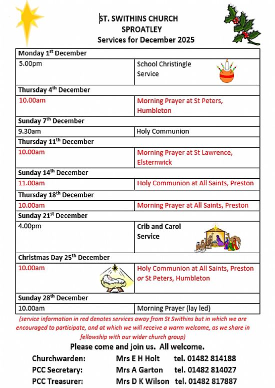 Why not come and join us in 2025? Details of services below. We now share in fellowship with more of our sister churches, including the new Thursday Morning Prayer services which are short and informal, and usually followed by coffee and chat. And our Coffee Mornings in the Village Hall resumed in January. We'd love to see you at any of our services or events.