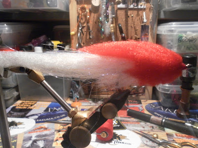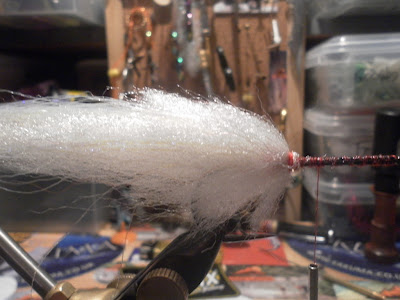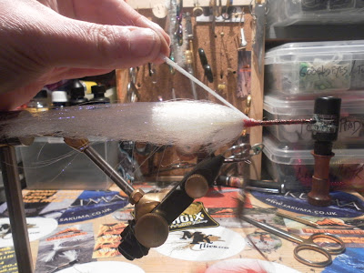 10- take half a dozen UV flash strands and run the length of the back of the fly and fold back the remaining short piece to lie along the back