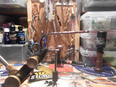 9- we now tie in some UV pearl flash hard to see in the picture but it runs along the side of the fly for the whole body length , you only need 3 or 4 strands